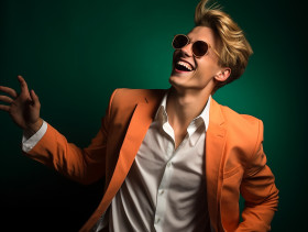 An attractive young man in an orange jacket and white jumpsuit i