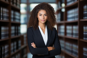 Empowered female attorney thriving in her legal career on blurred background