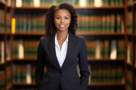 Skilled female legal assistant efficiently tackles tasks on blurred background