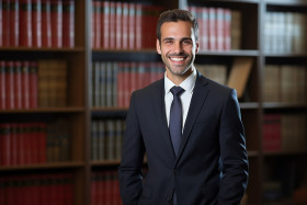 lawyer attorney office professional workplace desk computer paperwork friendly smiling happy helpful supportive male man paralegal assistant legal services modelImagine Buddy
