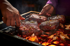 Skilled chef perfectly sears a juicy steak
