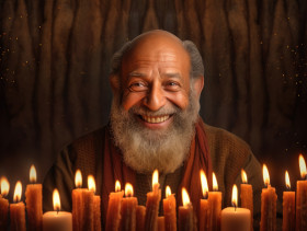 happy senior man beard smiling candles celebration birthday cake wish elderly grandfather retirement love family joy laughter togetherness hope optimism wisdom experience patriarch tradition religion faith spirituality peace contentment serenity calm warm cozy inviting festiveImagine Buddy
