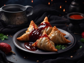 samosa cheese ketchup indian food snack appetizer savory flaky crispy golden brown triangle filling vegetarian spices herbs delicious flavorful popular street food tradition culture cuisine aroma texture indulgence hot spicy cheesy tangyImagine Buddy