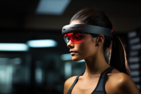 runner ar glasses augmented reality exercise fitness health technology tracking biometrics data health monitoring workout running athlete progress analytics wearable innovation digital sport training efficiency improvement statistics information display futurism hyperrealistic hdImagine Buddy