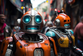 tech festivity colorful celebration creative modern robots interactive playful imaginative joy futurism vibrant entertainment futuristic innovation world advanced robotics extravaganza technology future atmosphere carnival fun playfulness event futurism hyperrealistic hdImagine Buddy