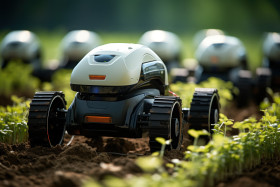 Automated agriculture robots tending crops in high tech farms, f