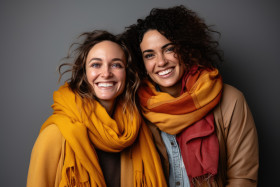 Exchanging cozy scarves as a symbol of friendship with smiles an