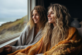 Friends wrapped in blankets sipping chamomile tea by the window,