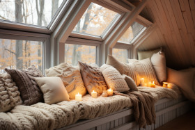 A comfortable window spot enhanced by colorful sweater pillow accents