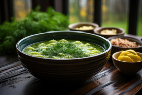 Hot soup on a rainy day with raindrops in the background