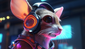 A mouse with headphones is in neon glow, midjourney ai art, ai art, midjourney free prompts