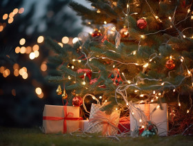 Christmas presents next to the tree with lights on, festivals, c