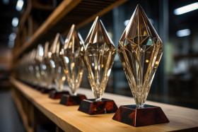 Close up view of trophies showcasing employee success, employee recognition images