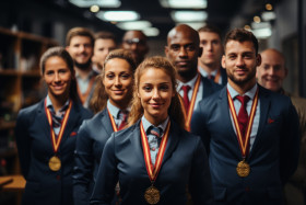 Employees share virtual cheers with medals in hand, recognition and reward images