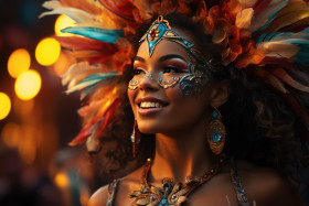 Carnival masked woman spectacular fire dancing display, festive carnival photos