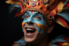 Masked aerial spectacle man acrobatics defying gravity, festive carnival photos