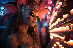 Woman explores carnival labyrinth in mask, festive carnival photos