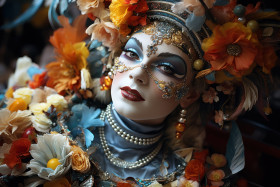 Bustling carnival bazaar masks fabrics and trinkets, carnival festival pictures