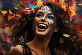 Dynamic celebration woman freezing carnival confetti, colorful carnival images