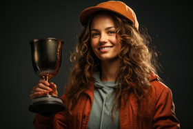 Glorious triumph woman raises trophy in celebration, female empowerment image