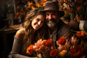 Couple crafting pottery together in a romantic workshop, engagement, wedding and anniversary image