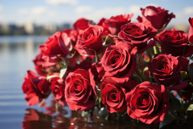 Red roses reflected in the tranquil waters of a clear lake, valentine, dating and love proposal image