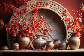 Colorful ceramic vases overflowing with blooms on a mosaic table, valentine, dating and love proposal image