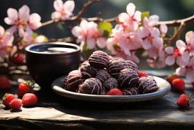Chocolate coated strawberries in a peaceful japanese garden, valentine, dating and love proposal image