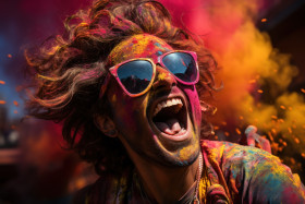 festive festivity holi holi powder vibrant explosion rhythm festival glitter party hd musical cheerful sparkle colorful confetti celebration carnival eruption hyperrealistic revelry joy horns burstImagine Buddy