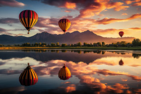 Lakeside sunrise hot air balloons casting reflections, beautiful sunrise image