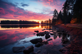 Vibrant hues embracing tranquil waters, beautiful sunrise image