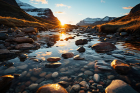 Reflective waters amidst mountains, beautiful sunrise image