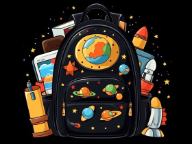 A backpack and school supplies are on a black background, digital illustration, character illustration