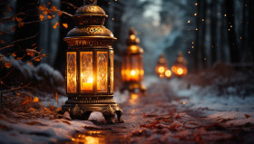 Enchanting snowy scene with a softly lit lantern, ramadan and eid mubarak images