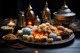 cultural harmony festive atmosphere dessert seasonal delights traditional sweets celebration cultural heritage hyperrealistic moon festive season traditional cuisine ramadan islamic traditions cultural fusion ramadan feast sweet delicacies holiday seasonal decor crescent culinary traditions religious customs sweet treats religious celebration eid cultural celebration festive islam cultural diversity delight cultural richness festive joy hd culinary experience muslim traditional decorations special occasion festivity mosque middle eastern culture cultural symbols culinary art festival mosque ornaments religiousImagine Buddy