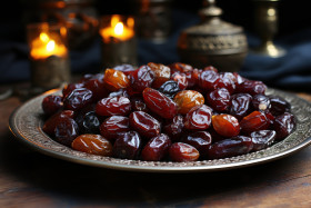 A cozy evening with dates beautifully arranged on a wooden table, ramadan and eid mubarak images
