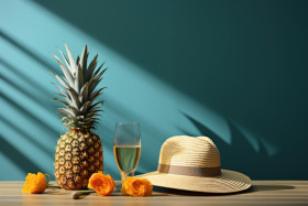 Hat pineapple shells and beer bottle creating a coastal scene, relaxing summer scene