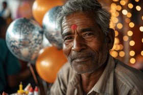 Indian man on his birthday with balloons, active seniors lifestyle images