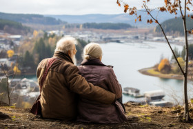elderly couple cliff river sitting senior lifestyle male man hyperrealistic hd vista peaceful tranquility viewpoint serenity elderly relaxation elderly lifestyle contemplative moment elderly serenity tranquil moment scenic serene landscape relaxation nature scenic overlook riverbank riverside tranquility riverside view contemplation peaceful scenery cliffside view elderly couple admiration female womenImagine Buddy
