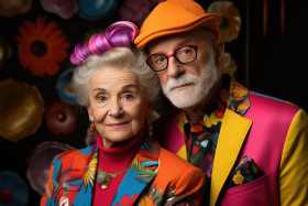 older lady man brightly colored vibrant clothing colorful elderly couple senior lifestyle male hyperrealistic hd elegance fashion statement colorful clothing vibrant outfits fashionably dressed vivid colors fashionably colorful cheerful radiant fashion bright attire fashion elderly elegance vivid wardrobe attire bold hues elderly fashion older lady vibrant presence colorful charm senior lifestyle female womenImagine Buddy