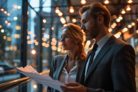 Businessman and woman examining paperwork with focused expressions in a glass walled office, business meeting photo