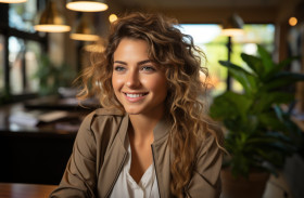 Smiling female entrepreneur focused on her laptop in a modern workspace, business meeting photo