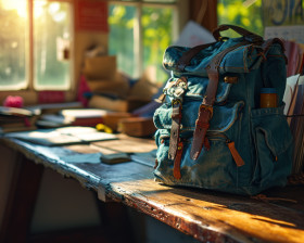A blue backpack with papers inside in a classroom setting, education pictures for website