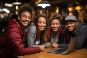 Students gathered around a table with a laptop collaborating on a project and engaging in teamwork, education pictures for website