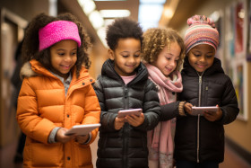 Children in a hallway captivated by a tablet discovering and sharing digital wonders in a group setting, education pictures for website