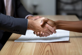 Employee shaking hands over document at desk, hiring image for job postings