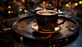 A coffee cup resting on a tech circuit board, beautiful coffee cup image