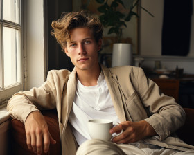 young male sitting couch home coffee relaxation leisure lifestyle cup drink beverage caffeine hyperrealistic hd refreshment chilling cozy enjoying young indoors comfortable casual peaceful breakImagine Buddy