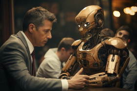 businessman speaking robots meeting conversation discussion collaboration futuristic robotic technology hyperrealistic hd artificial intelligence creative corporate office innovation colleague ideas interaction communication teamwork modern future professional technology work brainstorming talking workplace automation presentationImagine Buddy