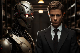 young businessman robot suits partnership futuristic robotic technology hyperrealistic hd work ai cooperation future collaboration deal agreement career conclusion machine happy ending business attire innovation teamwork creative handshake artificial intelligence professional success technologyImagine Buddy